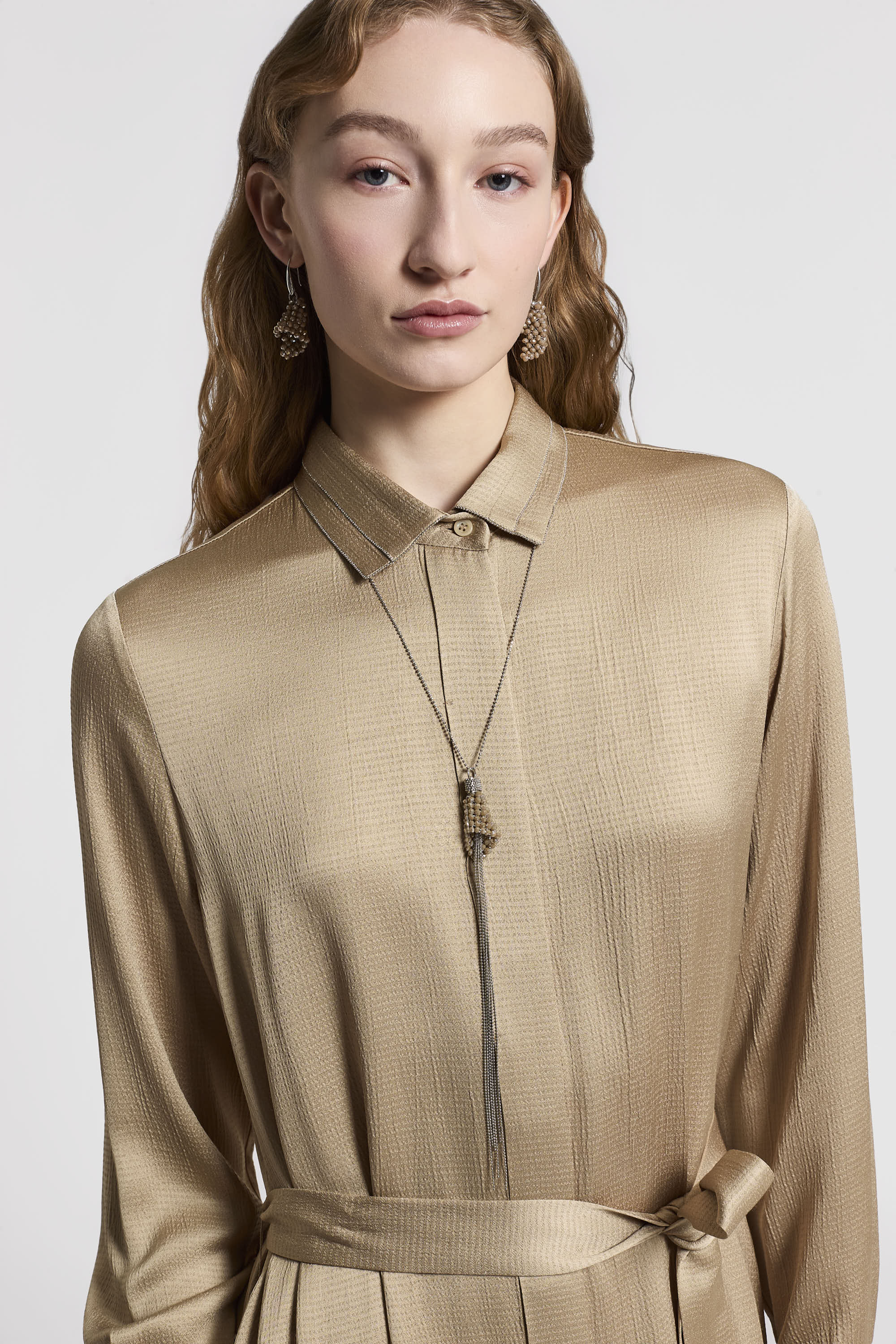 This long-sleeved shirt dress is made from a special fluid hammered viscose satin fabric, which creates a fluid effect with its wavy texture, attenuating curves with natural elegance.