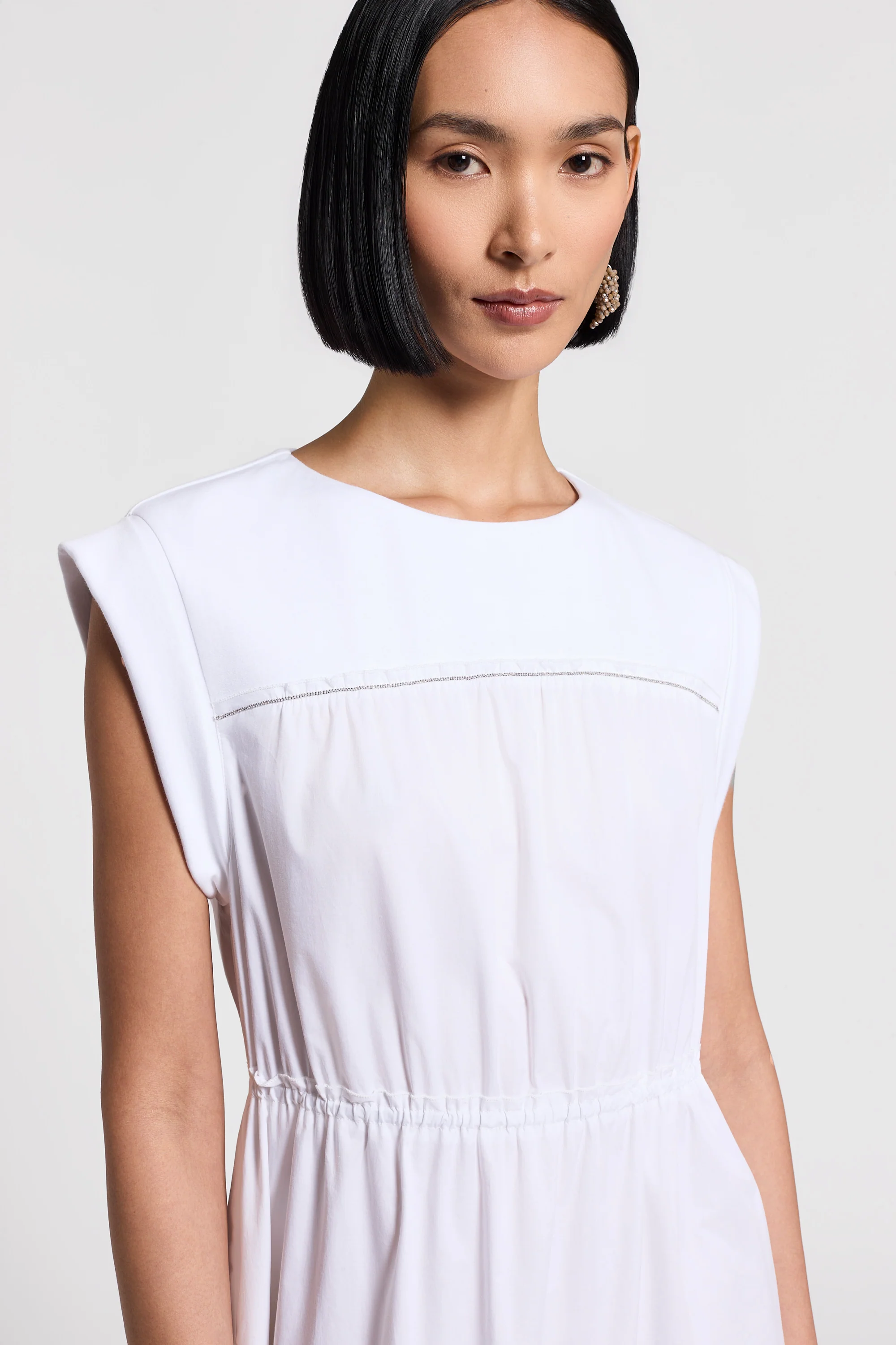 This midi dress combines the lightness of technical cotton with the softness of the jersey in the yoke, defined by the dainty Punto Luce detailing.