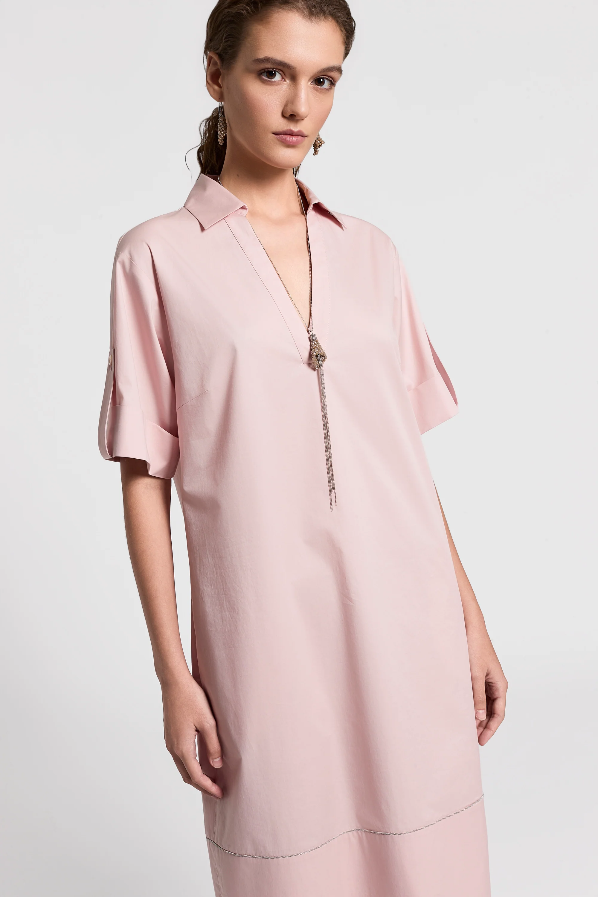 In this sail-hand cotton midi dress, elegance meets lightness and comfort. The spread collar features a V-neck, while the sleeves have a turn-up with buttoned tab detail.