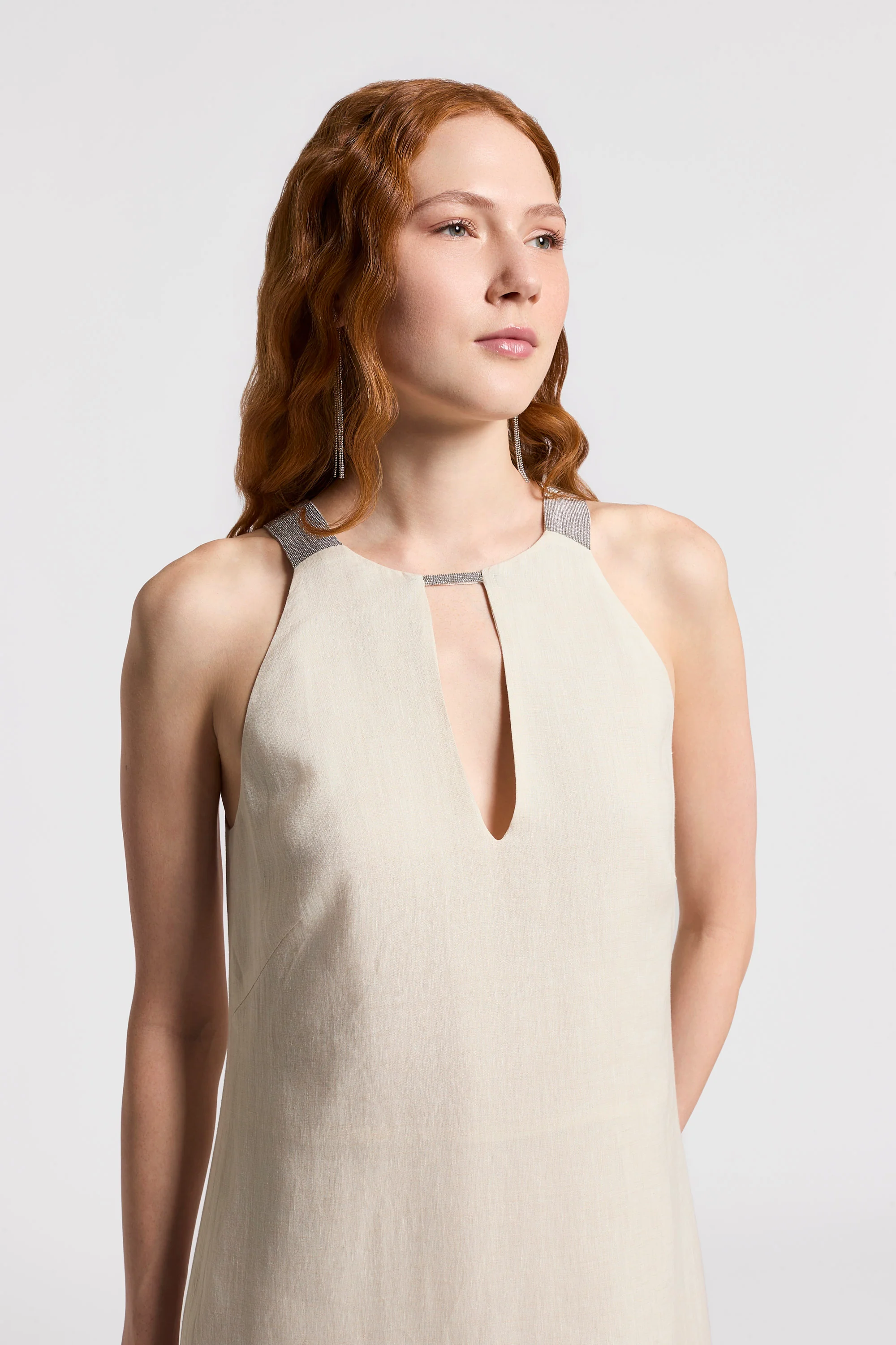 Crafted from pure linen, this dress is essential and refined. The crew neck opens in a delicate "V" detail, embellished in the center with the iconic Punto Luce detail, echoed on the shoulders for a bright and sophisticated touch.
