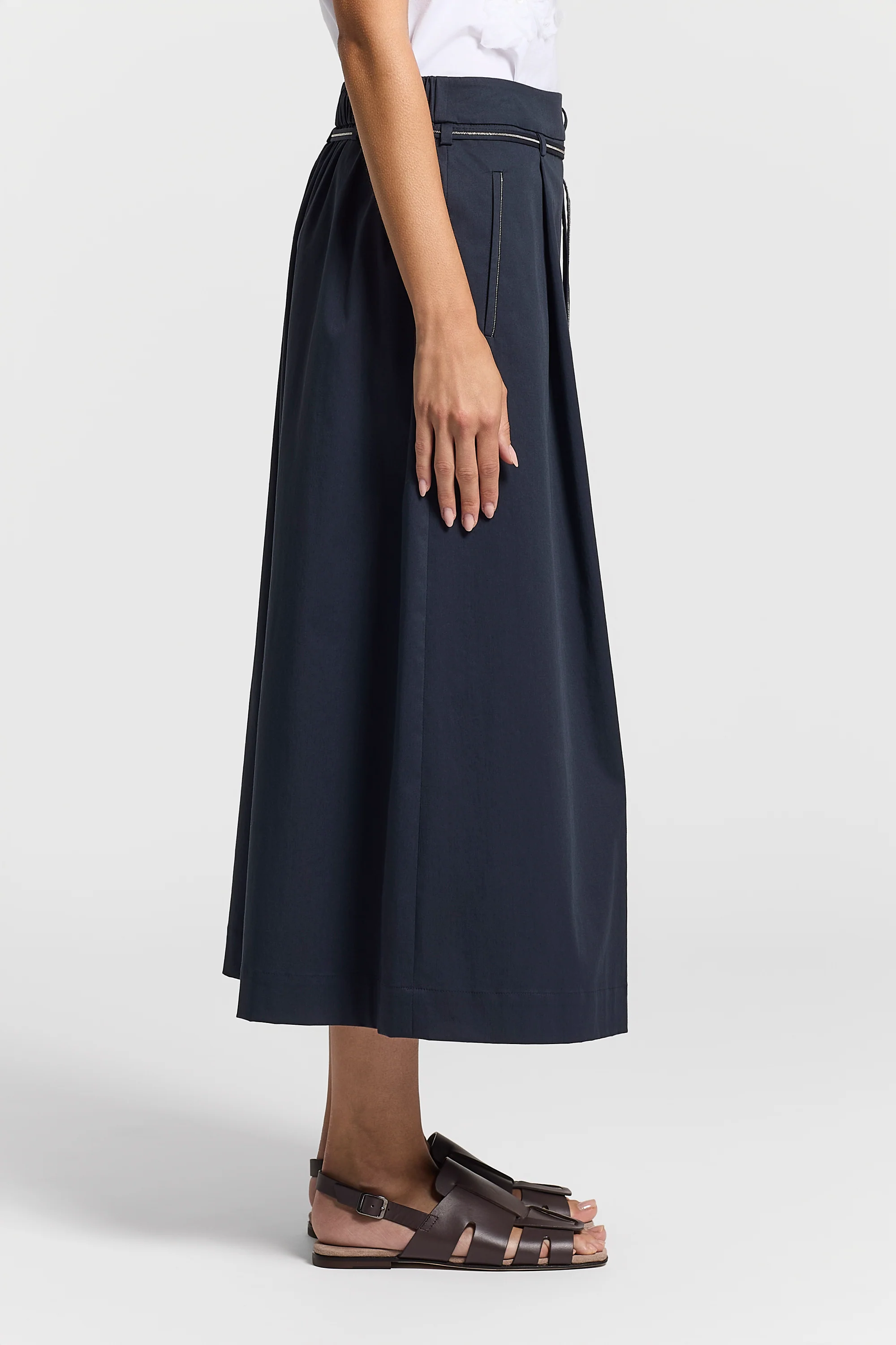 This skirt features a few pleats on the top and outlines a soft and harmonious volume, while the fabric strap with Punto Luce detail gently catches the light.